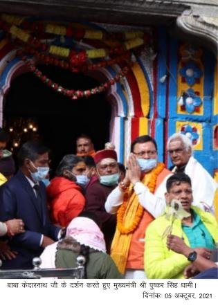 मुख्यमंत्री पुष्कर सिंह धामी आज प्रातः 9 बजे निर्धारित कार्यक्रम के अनुसार केदारनाथ धाम पहुंचे। हेली पेड पर देवस्थानम बोर्ड, जिला प्रशासन सहित तीर्थ पुरोहितों ने उनकी अगवानी की तथा स्वागत किया गया।