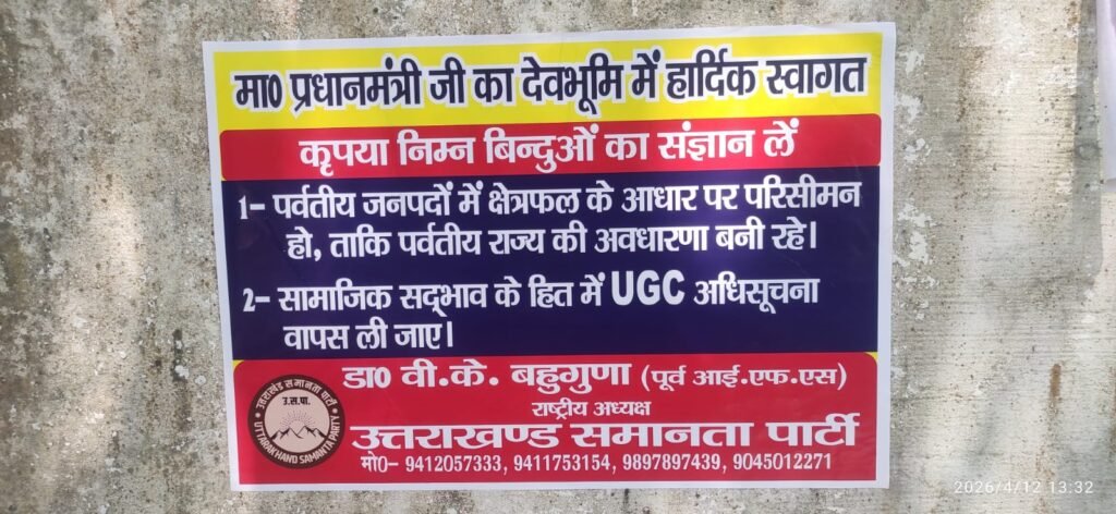 कहा गया राज्य के पर्वतीय जनपदों में आगामी विधानसभा सीटों के परिसीमन में क्षेत्रफल को भी आधार बनाया जाय।कहा गया कि यदि केवल जनसंख्या के आधार पर परिसीमन किया गया तो स्वास्थ्य शिक्षा एवं जंगली जानवरों के आतंक से पर्वतीय क्षेत्रों से हो रहे पलायन के चलते विधानसभा में पर्वतीय जनपदों का प्रतिनिधित्व काफी घट जाएगा जिससे पहले से ही अविकसित गांवों विकास अवरुद्ध हो जाएगा।लोगो के अपने प्रतिनिधियों से मिलना भी कठिन हो जाएगा। कहा गया कि जम्मू कश्मीर की तर्ज पर परिसीमन में क्षेत्रफल को भी आधार बनाया जाय।यूजीसी के संशोधित प्राविधानों को तत्काल वापस लिया जाय ।कहा गया कि नए संशोधनों से समाज की एकरस्ता की भावना समाप्त होगी ।तथा झूठी शिकायत करता के विरुद्ध कोई कार्यवाही न होने के प्राविधान के चलते प्राकृतिक न्याय के अधिकार का भी उल्लंघन होगा। हालांकि पार्टी उक्त मांगो के निस्तारण के लिए ध्यानाकर्षण हेतु देहरादून में परिसीमन रोको रैली के माध्यम से अपनी बात स्थानीय प्रशासन के माध्यम से संबंधितों तक पहुंचा चुकी है यूजीसी के नए प्राविधानों को वापस लेने हेतु महामहिम राष्ट्रपति माननीय प्रधान मंत्री जी एवं यूजीसी के अध्यक्ष जी को विभिन्न जनपदों के जिलाधिकारियों के माध्यम से ज्ञापन भेज चुकी है। तथा राष्ट्रीय स्तर पर यूजीसी के खिलाफ आयोजित कार्यक्रमों में शिरकत कर चुकी है अब प्रधानमंत्री जी के देहरादून आगमन पर पोस्टरों के माध्यम से पार्टी द्वार अपना मंतव्य रखे जाने के निर्णय लिया गया। आयोजित बैठक में पार्टी के राष्ट्रीय प्रमुख महासचिव इंजीनियर लक्ष्मी प्रसाद रतूड़ी महासचिव त्रिलोक सिंह नेगी महासचिव संगठन श्रीधर प्रसाद नैथानी मीडिया प्रभारी विनोद कुमार धस्माना प्रमुख सलाहकार विनोद प्रकाश नौटियाल जगदीश प्रसाद कुकरेती राष्ट्रीय उपाध्यक्ष चंदन सिंह नेगी कार्यकारी अध्यक्ष बलवीर सिंह भंडारी भूपेंद्र वशिष्ठ आदि सम्मिलित थे।