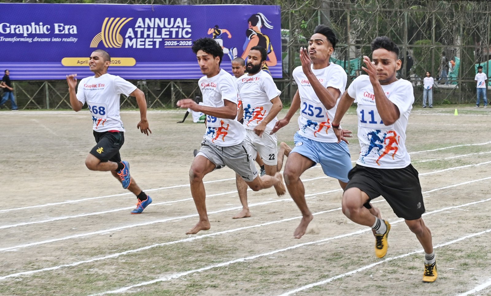 एथलेटिक मीट में ग्राफिक एरा डीम्ड यूनिवर्सिटी के प्रो चांसलर डा. राकेश कुमार शर्मा, कुलपति डा. नरपिंदर सिंह, प्रो वीसी डा. संतोष एस सर्राफ, कुलसचिव डा. नरेश कुमार शर्मा, ग्राफिक एरा हिल यूनिवर्सिटी के कुलपति डा. अमित आर. भट्ट, कुलसचिव डा. डी. के. जोशी, अन्य पदाधिकारी, डीन, विभागाध्यक्ष, शिक्षक- शिक्षिकाएं और छात्र-छात्राएं ने शामिल होकर प्रतिभागियों का उत्साहवर्धन किया।