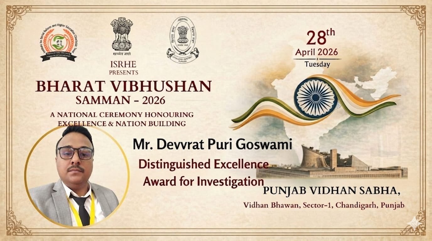 देहरादून: 28 अप्रैल 2026- देश की जांच जगत में एक बड़ी उपलब्धि सामने आई है। “भारत विभूषण सम्मान – 2026” के प्रतिष्ठित राष्ट्रीय मंच पर उत्तराखंड के देवव्रत पुरी गोस्वामी (डिटेक्टिव देव) को उनके असाधारण जांच कार्यों के लिए पंजाब विधानसभा के विधान भवन, चंडीगढ़ में “जांच के लिए विशिष्ट उत्कृष्टता पुरस्कार” से सम्मानित किया गया।