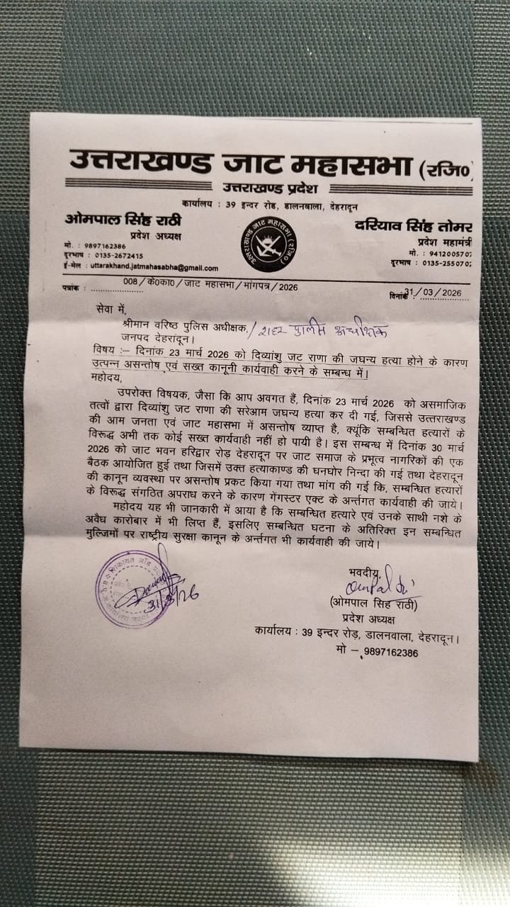 आज तय कार्यक्रम के अनुसार उत्तराखंड जाट महासभा और संयुक्त सर्व समाज की ओर से सुबह11:30 बजे वरिष्ठ पुलिस अधीक्षक देहरादून को दिव्यांशु जटराना हत्याकांड में शामिल सभी अपराधियों को जल्द से जल्द गिरफ्तारी की मांग कर एक ज्ञापन सौंपा गया, ज्ञापन में उत्तराखंड जाट महासभा और संयुक्त सर्व समाज संगठन की ओर से अभी तक सभी अभियुक्तों की गिरफ्तारी न होने पर चेतावनी दी गई ।