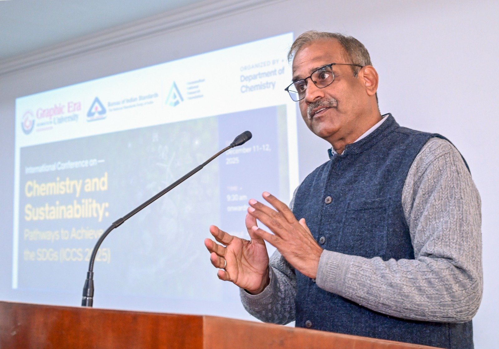 ग्राफिक एरा डीम्ड यूनिवर्सिटी के प्रो चांसलर डा. राकेश कुमार शर्मा ने कहा कि रसायन विज्ञान बहुत महत्वपूर्ण है। इसमें दो तरह का असर होता है-एक ओर यह प्रदूषण और संसाधनों की कमी जैसी समस्याएं पैदा कर सकता है और वहीं दूसरी ओर यही विज्ञान धरती को बचाने और संसाधनों को फिर से बेहतर बनाने का रास्ता भी दिखाता है। उन्होंने कहा कि आज एक्यूआई में गिरावट, मिट्टी का खराब होना, पानी का प्रदूषण और प्राकृतिक संसाधनों की कमी जैसी कई समस्याएं सामने हैं। ऐसे में युवाओं को जिज्ञासु होकर नए समाधान ढूंढने चाहिए, ताकि वे अपने भविष्य को बेहतर बना सकें।