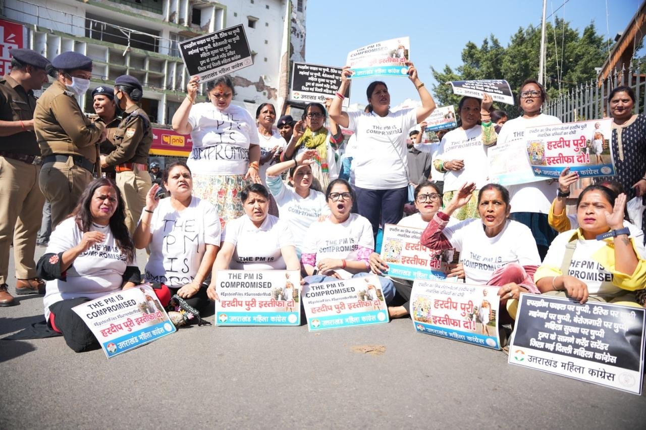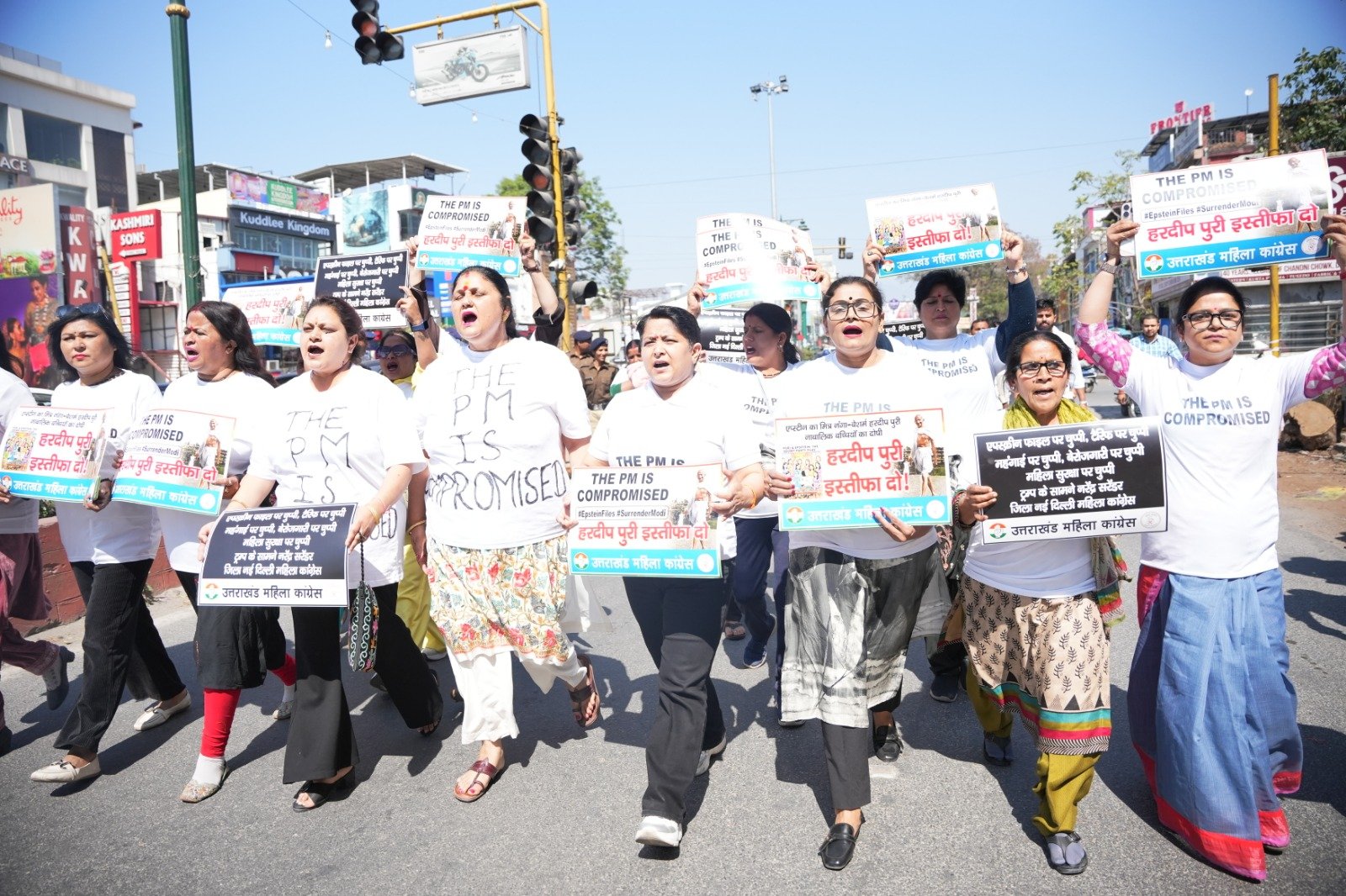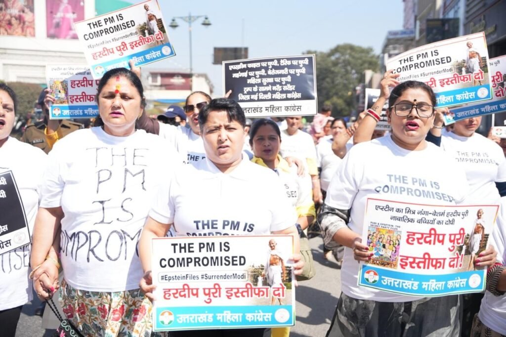 प्रधानमंत्री नरेन्द्र मोदी एवं केन्द्रीय मंत्री हरदीप पुरी का नाम एपस्टीन फाईल में उजागर होने पर हरदीप पुरी के इस्तीफे की मंाग को लेकर आज प्रदेश महिला कांग्रेस अध्यक्ष ज्योति रौतेला के नेतृत्व में महिला कंाग्रेस कार्यकर्ताओं ने प्रदेश कांग्रेस कार्यालय राजीव भवन से गांधीपार्क-घंटाघर-पल्टन बाजार होते हुए तहसील चौक एवं वापस प्रदेश कांग्रेस कार्यालय तक **THE PM IS Compromised** लिखी विषेश पोषाक पहनकर विरोध-प्रदर्शन के साथ मार्च निकाला तथा केन्द्रीय मंत्री हरदीप पुरी के इस्तीफे की मांग की।