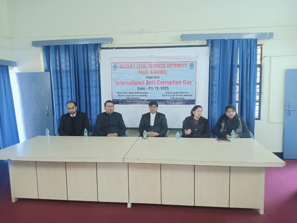 पौड़ी- अंतर्राष्ट्रीय भ्रष्टाचार विरोधी दिवस के अवसर पर जिला न्यायालय परिसर सभागार कक्ष में मंगलवार को विधिक साक्षरता एवं जागरूकता शिविर का आयोजन किया गया। शिविर में नालसा थीम “एक मुट्ठी आसमान” के अंतर्गत लोकपाल तथा अंतर्राष्ट्रीय भ्रष्टाचार विरोधी दिवस से संबंधित लघु वीडियो प्रदर्शित की गयी।