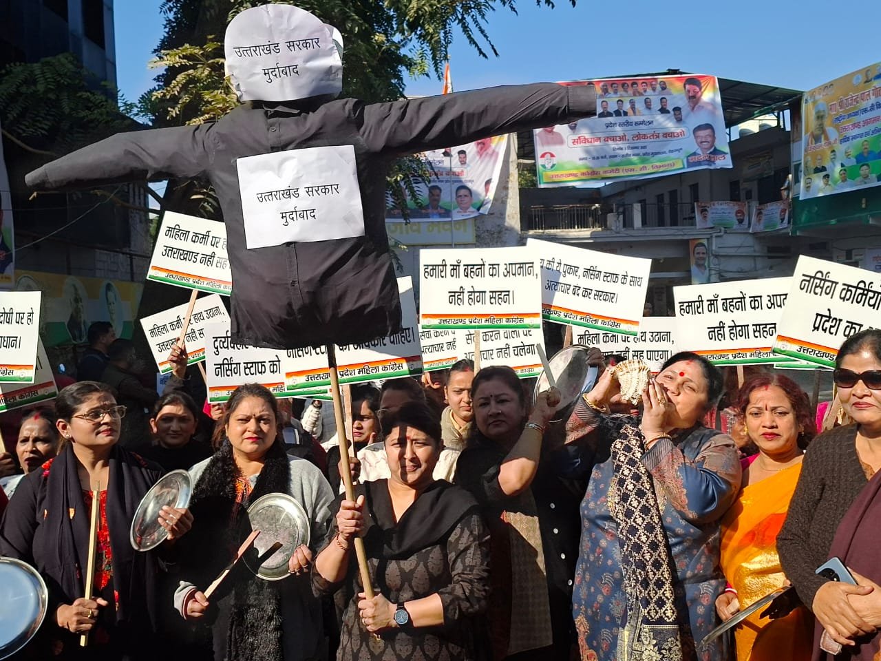 नर्सिंग बेरोज़गार युवतियों के शांतिपूर्ण प्रदर्शन के दौरान महिला पुलिसकर्मियों द्वारा की गई अभद्रता और थप्पड़ मारने की घटना के विरोध में आज उत्तराखंड महिला कांग्रेस ने प्रदेश अध्यक्ष ज्योति रौतेला के नेतृत्व में प्रदेश कांग्रेस मुख्यालय से चलकर पुलिस मुख्यालय पर जोरदार प्रदर्शन कर घेराव किया। इस विरोध कार्यक्रम में बड़ी संख्या में नर्सिंग बेरोजगार युवतियाँ भी उपस्थित रहीं।