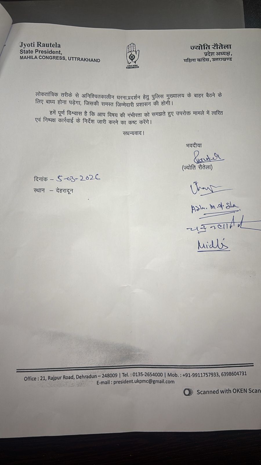ज्ञापन देने वालों में प्रदेश अध्यक्ष ज्योति रौतेला के अलावा प्रदेश उपाध्यक्ष आशा मनोरमा शर्मा, महानगर अध्यक्ष उर्मिला थापा, महासचिव निधि नेगी, चन्द्रकला नेगी आदि कांग्रेस पदाधिकारी शामिल थे।