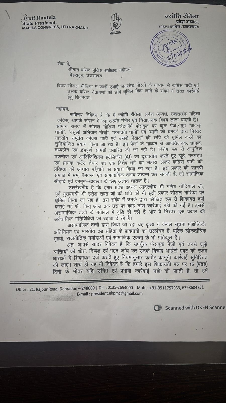 वरिष्ठ पुलिस अधीक्षक को सौंपे ज्ञापन में प्रदेश कंाग्रेस अध्यक्ष ज्योति रौतेला ने कहा कि सोशल मीडिया में फर्जी एआई जनरेटेड पोस्टों के माध्यम से कांग्रेस पार्टी एवं उसके वरिष्ठ नेतागणों की छवि धूमिल किया जाना अत्यंत गंभीर एवं चिंताजनक विषय है। उन्होंने कहा कि वर्तमान समय में सोशल मीडिया प्लेटफॉर्म फेसबुक पर कुछ पेज/ग्रुप जिनमें “धाकड़ धामी”, “वसूली अभियान मोर्चा”, “सनातनी धामी” एवं “धामी की धमक” द्वारा निरंतर भारतीय राष्ट्रीय कांग्रेस पार्टी एवं उसके नेताओं की छवि को धूमिल करने का सुनियोजित प्रयास किया जा रहा है। इन पेजों के माध्यम से आपत्तिजनक, भ्रामक, तथ्यहीन एवं द्वेषपूर्ण सामग्री प्रसारित की जा रही है। विशेष रूप से आधुनिक तकनीक एवं आर्टिफिशियल इंटेलिजेंस (AI) का दुरुपयोग करते हुए झूठे, मनगढ़ंत एवं भ्रामक कंटेंट तैयार कर एक विशेष धर्म का सहारा लेकर कांग्रेस पार्टी की प्रतिष्ठा को आघात पहुँचाने का प्रयास किया जा रहा है। इस प्रकार की सामग्री समाज में भ्रम, वैमनस्य एवं साम्प्रदायिक तनाव उत्पन्न कर सकती है, जो सामाजिक सौहार्द एवं कानून-व्यवस्था के लिए अत्यंत घातक है। उल्लेखनीय है कि हमारे प्रदेश अध्यक्ष आदरणीय श्री गणेश गोदियाल जी, पूर्व मुख्यमंत्री श्री हरीश रावत जी की छवि को भी इसी प्रकार सोशल मीडिया पर धूमिल किया जा रहा है। इस संबंध में उनके द्वारा लिखित रूप से शिकायत दर्ज कराई गई थी, किंतु आज तक उस पर कोई ठोस कार्रवाई नहीं की गई है। इससे असामाजिक तत्वों के मनोबल में वृद्धि हो रही है और वे निरंतर इस प्रकार की अवैधानिक गतिविधियों को बढ़ावा दे रहे हैं। असामाजिक तत्वों द्वारा किया जा रहा यह कृत्य न केवल सूचना प्रौद्योगिकी अधिनियम एवं भारतीय दंड संहिता के प्रावधानों का उल्लंघन है, बल्कि लोकतांत्रिक मूल्यों, राजनीतिक मर्यादाओं एवं सामाजिक एकता के भी प्रतिकूल है।