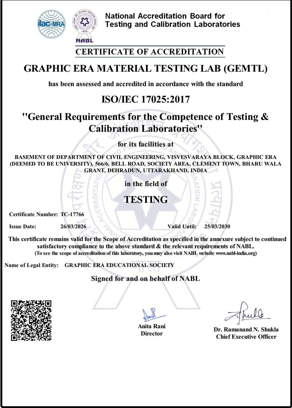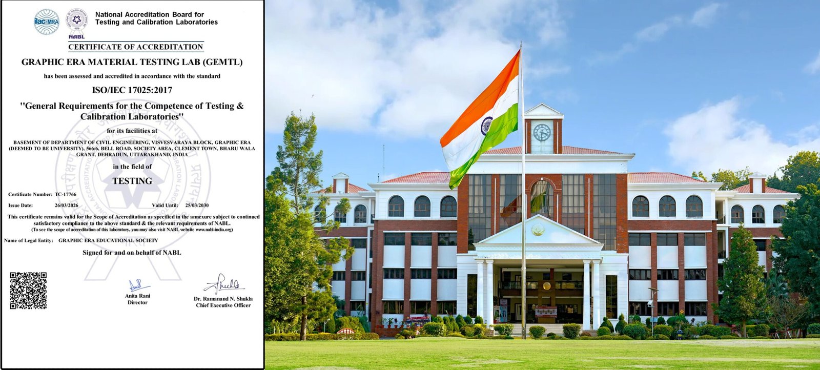 ग्राफिक एरा को एनएबीएल से मान्यता मिलना न केवल इसकी उच्च गुणवत्ता का प्रमाण है, बल्कि इसे अंतर्राष्ट्रीय मानकों के अनुरूप एक विश्वस्तरीय प्रशिक्षण केंद्र के रूप में भी स्थापित करता है। इसके लिए एनएबीएल ने ग्राफिक एरा डीम्ड यूनिवर्सिटी को आईएसओ/आईइसी 17025:2017 सर्टिफिकेट जारी करके जनरल रिक्वायरमेंट्स फॉर द कॉम्पिटेंस ऑफ टेस्टिंग एंड कैलिब्रेशन लैबोरेट्रीज का दर्जा दिया है।