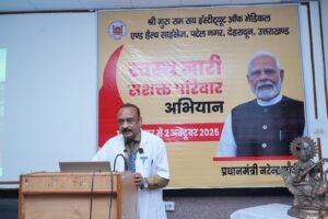 उन्होंने बताया कि श्री गुरु राम राय इंस्टीट्यूट ऑफ मेडिकल एंड हेल्थ साइंसेज एवं श्री महंत इन्दिरेश अस्पताल 17 सितम्बर से 2 अक्टूबर 2025 तक चलने वाले “व्यापक स्वास्थ्य पखवाड़ा कार्यक्रम” में उत्तराखंड स्वास्थ्य विभाग के साथ मिलकर विभिन्न स्थानों पर निःशुल्क स्वास्थ्य शिविरों का आयोजन कर रहा है। प्रधानमंत्री नरेंद्र मोदी के जन्मदिवस पर शुरू हुआ यह अभियान समाज को यह संदेश देता है कि “स्वस्थ नारी ही सशक्त परिवार की आधारशिला है।” श्री महंत इन्दिरेश अस्पताल का यह प्रयास निश्चित रूप से प्रदेश में महिला स्वास्थ्य जागरूकता को नई सकारात्मक दिशा देने वाला साबित होगा।