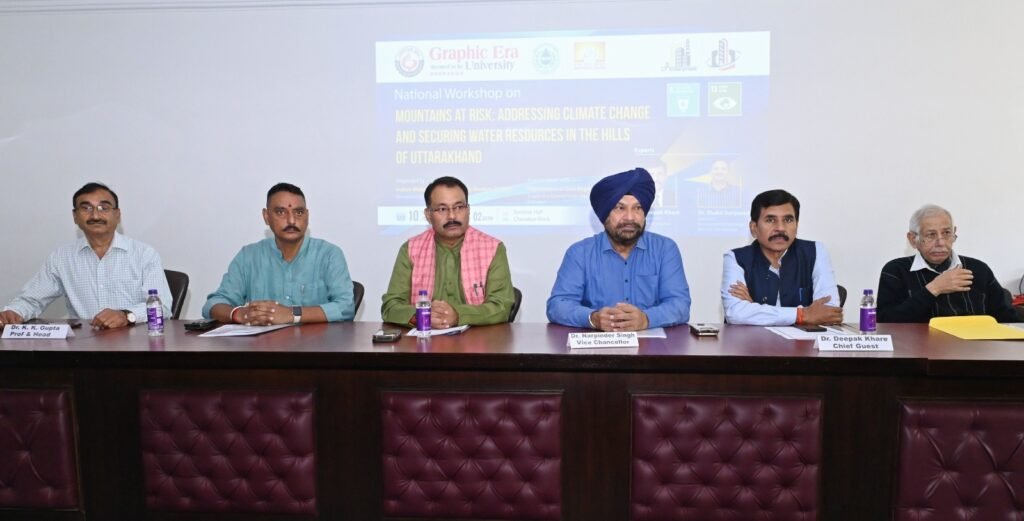 ग्राफिक एरा डीम्ड यूनिवर्सिटी में उत्तराखंड में जलवायु परिवर्तन और जल संसाधनों की सुरक्षा विषय पर कार्यशाला का आयोजन किया गया। कार्यशाला के मुख्य अतिथि आईआईटी रुड़की के डीन ऑफ फाइनेंस एंड प्लैनिंग, डा. दीपक खरे ने कहा कि पर्वतों की संरक्षण का पहला और सबसे महत्वपूर्ण कदम है पर्वतों का यथार्थपरक विश्लेषण जिससे उनकी वर्तमान स्थिति, कमजोरियों और संभावित खतरों को पूरी तरह समझा जा सके। उन्होंने सतत् विकास पर जोर देते हुए कहा कि जलवायु परिवर्तन के प्रभाव और पर्वतीय क्षेत्रों में जल संसाधनों की सीमाओं को ध्यान में रखते हुए स्मार्ट और टिकाऊ उपाय अपनाना आज की आवश्यकता है।